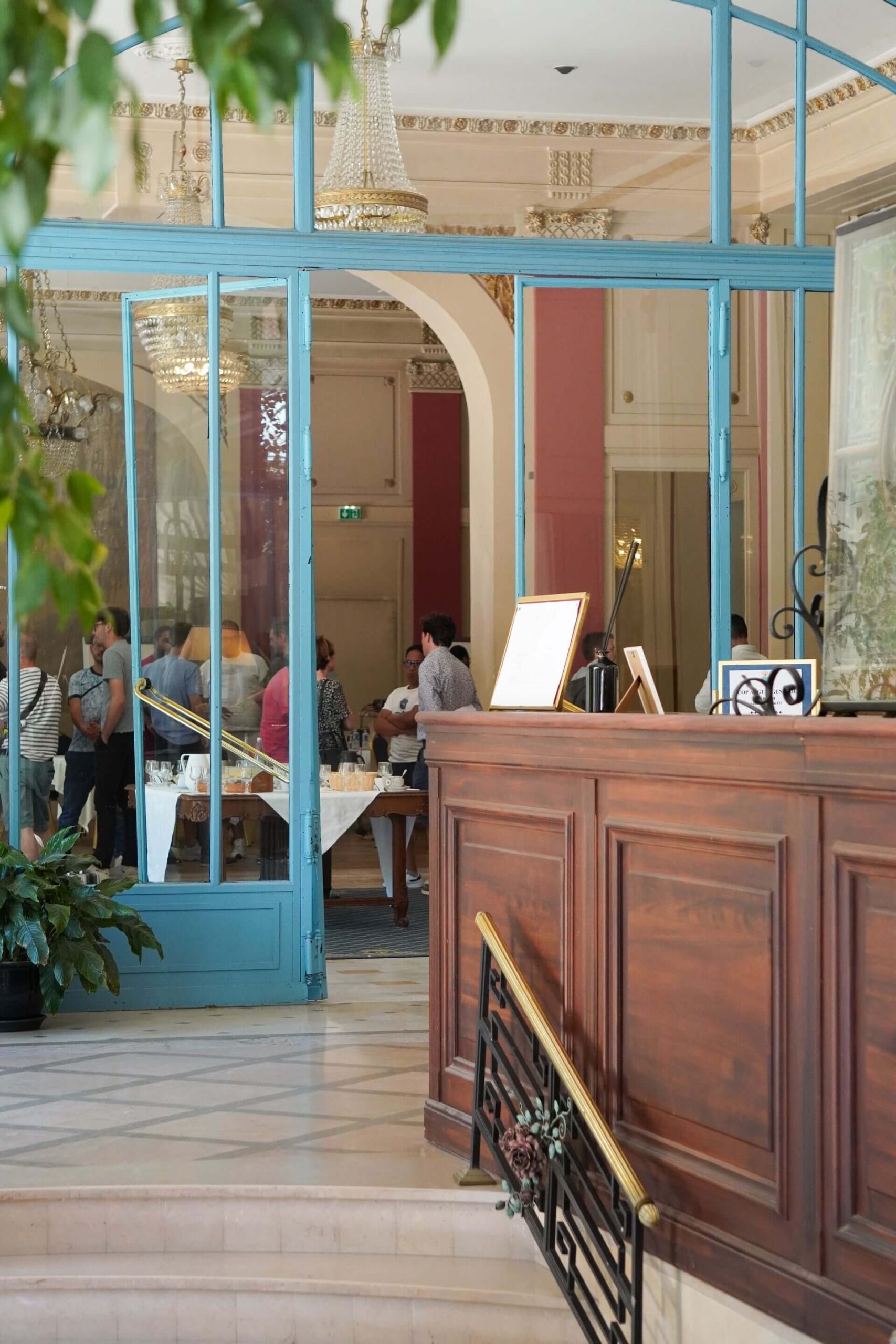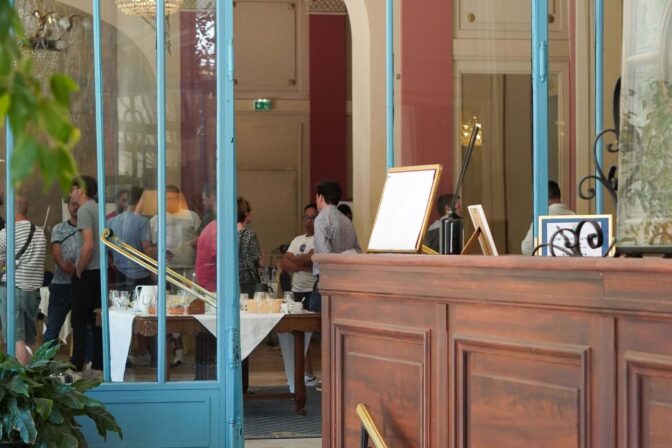 En 1882, l’Hôtel des Thermes connaît d’importantes transformations. Sous la direction de l’architecte Révoil, le rez-de-chaussée côté rue Alquié est entièrement réaménagé pour créer une vaste salle à manger. Cette salle rectangulaire, aménagée pour la « table d’hôtes », est divisée en travées supportées par des colonnes en fonte et ornée de peintures et plafonds décoratifs. De larges fenêtres apportent lumière et élégance, marquant une étape décisive dans l’évolution de l’hôtel.