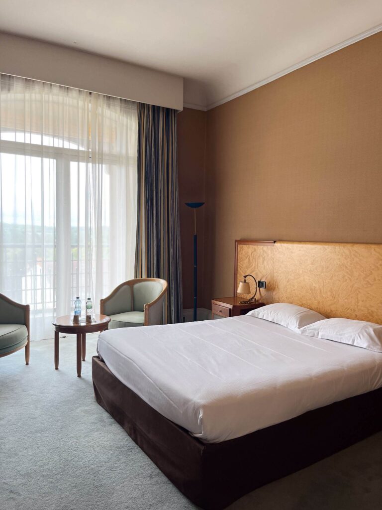 Chambre spacieuse ouverte sur le parc des Sources ou le parc d’Allier. Le décor allie un grand raffinement traditionnel au confort le plus contemporain. Murs, rideaux et dessus de lit offrent des coloris en camaïeu, bois de rose, bleu ou vert tendre.