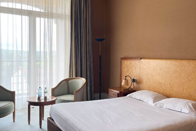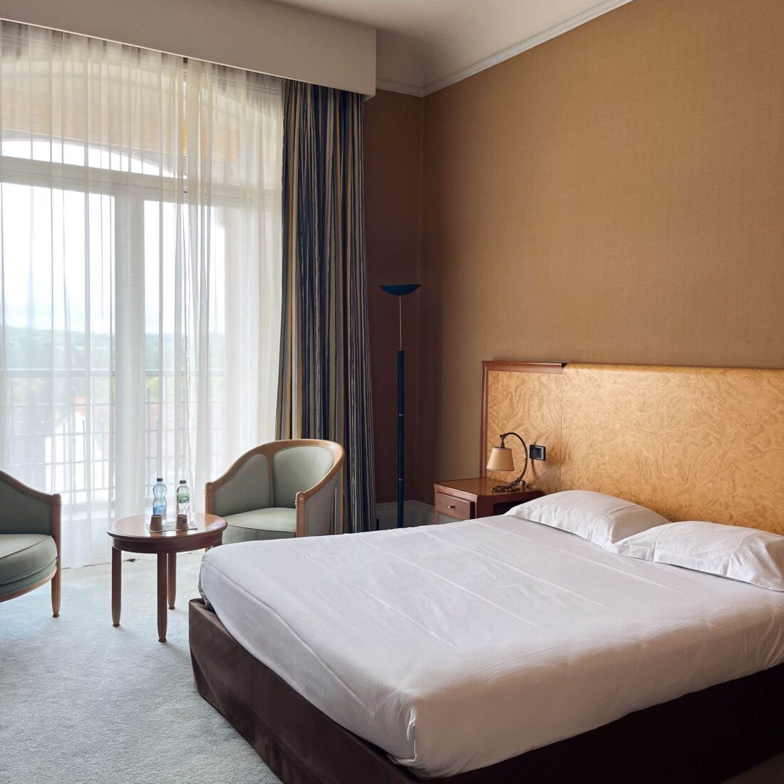Chambre spacieuse ouverte sur le parc des Sources ou le parc d’Allier. Le décor allie un grand raffinement traditionnel au confort le plus contemporain. Murs, rideaux et dessus de lit offrent des coloris en camaïeu, bois de rose, bleu ou vert tendre.